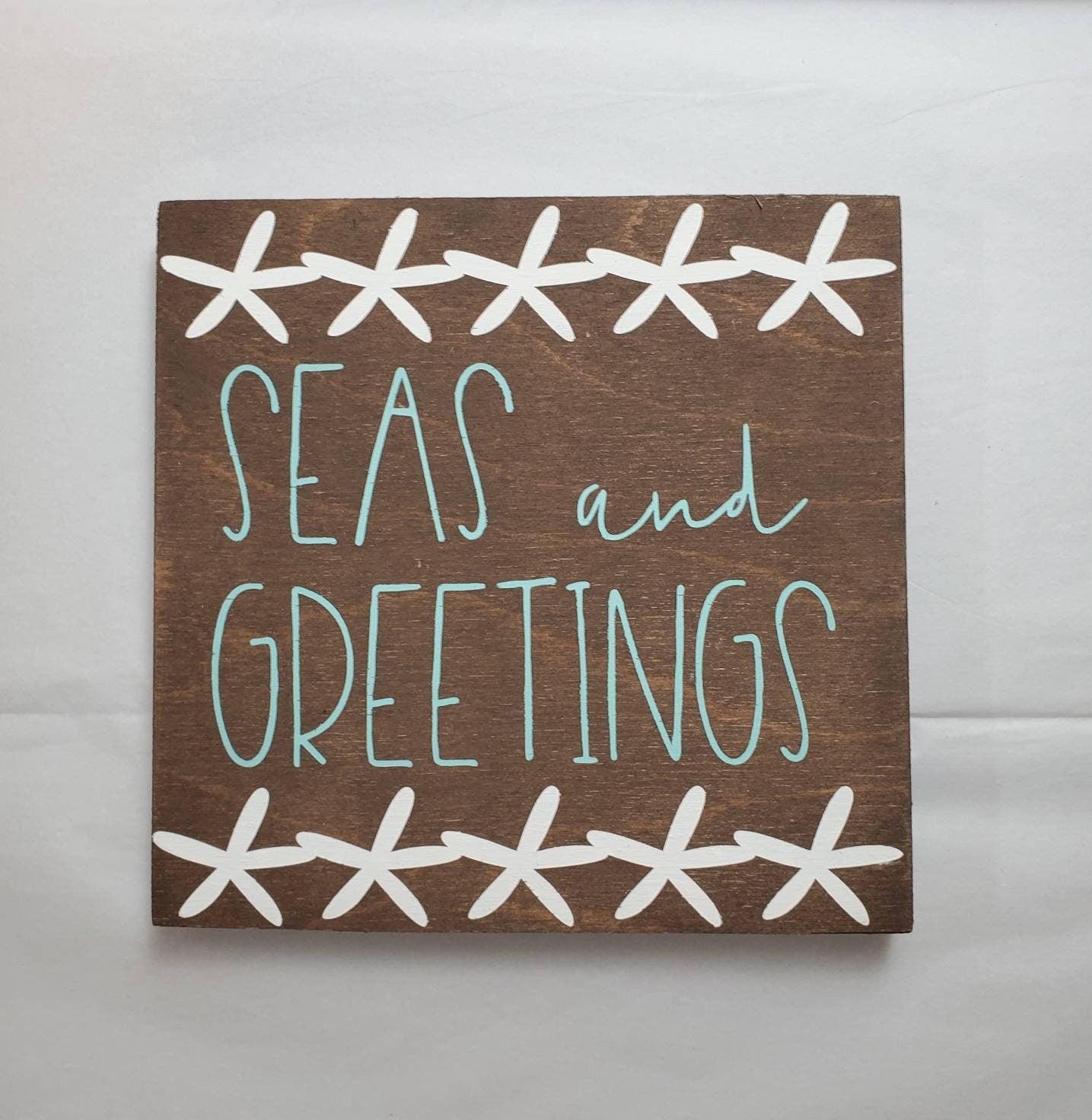 Seas and Greetings Wood Sign – Hand-Painted Coastal Christmas Decor for Beach Lovers