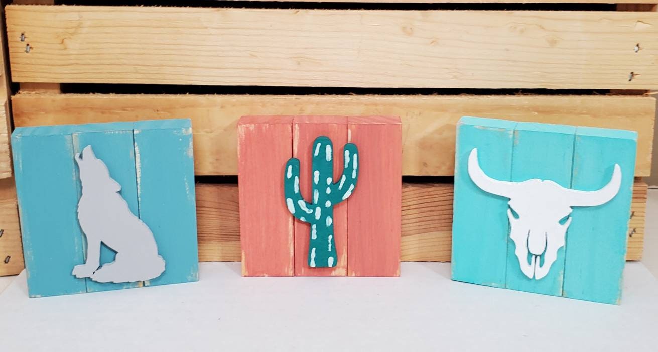 Each piece has been hand-painted, lightly distressed, and sealed for a beautifully worn look. The 3D signs—featuring a cow skull, gecko, cactus, grey wolf, mountains, and sun—have raised wood cutouts for added texture and depth. All items stand on their own, making them versatile for various displays.