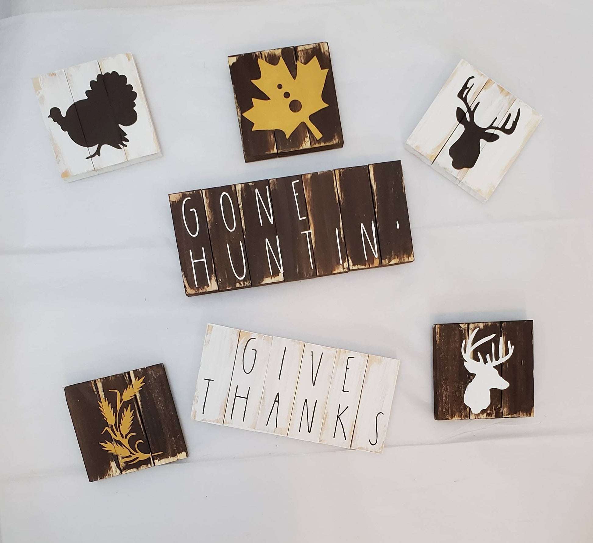 Celebrate the season with this Thanksgiving Hunting-Themed Tiered Tray Decor bundle—perfect for those who love fall, family traditions, and the great outdoors. Inspired by my own memories of deer hunting with family during Thanksgiving, this set includes hand-painted mini wood signs featuring a turkey, deer, wheat, and leaf accents, as well as heartwarming messages like Give Thanks and Gone Huntin’.